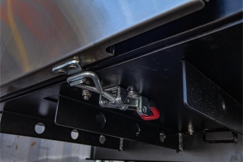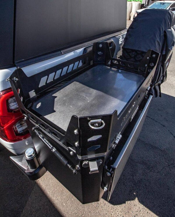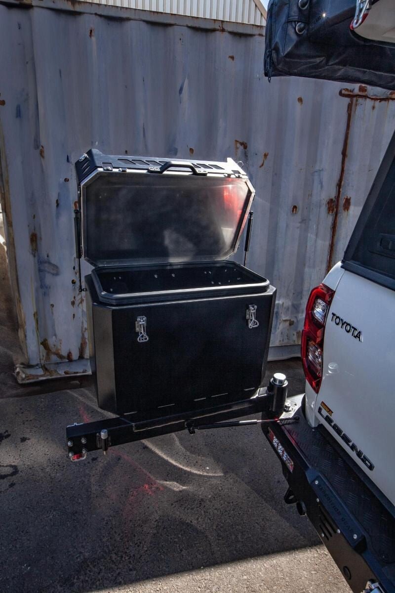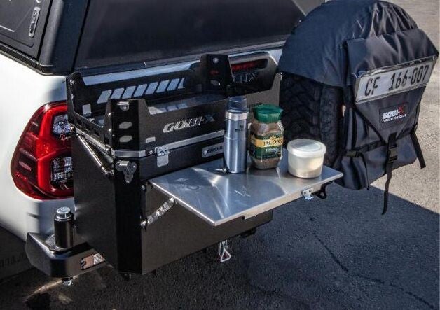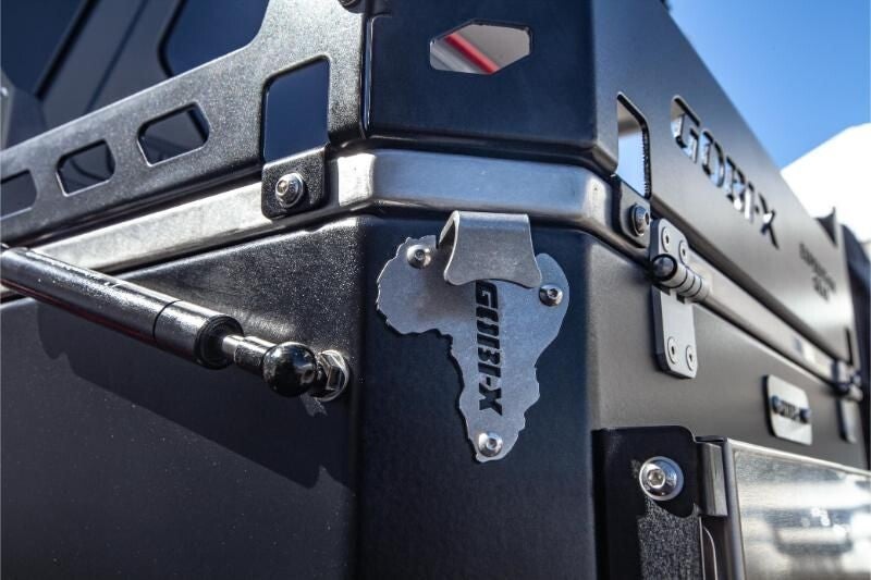 Der Gobi-X-Utility Box Carrier ist eine robuste und praktische Aufbewahrungslösung für Offroad-Enthusiasten, die sowohl die Zugänglichkeit als auch die Sicherheit schätzen. Diese Stahlschachtel ist mit einem haltbaren schwarzen Pulvermantel mit einem robusten Schwung-Arm montiert, ähnlich einem Rad oder einem Jerrycan-Träger, und befestigt direkt am Gobi-X-hinteren Stoßstange. Es schwenkt reibungslos zur Seite und ermöglicht einen freien Zugang zum Frachtbereich Ihres Fahrzeugs. Die Schachtel wird von einem Hochleistungsscharniersystem und einer Gasstrebe unterstützt, die es einfach macht, aufzuschwingen. Zusammen mit dem Hochleistungsschloss stellt dies sicher, dass das gesamte Gerät während der Fahrt sicher an Ort und Stelle bleibt. Der Edelstahldeckel ist mit einer hochwertigen Gummi-Dichtung ausgestattet, um sicherzustellen, dass Ihr Gang auch unter härtesten Bedingungen sauber und trocken bleibt. Für zusätzliche Sicherheit verfügt das Utility-Box über langlebige Resseln, die ein Vorhängeschloss (nicht enthalten) annehmen können, sodass Sie Ihr Fahrzeug unbeaufsichtigt lassen können. Der integrierte Flaschenöffner im afrikanischen Edelstahl im afrikanischen Stil in der Ecke der Schachtel, kombiniert mit seinem robusten Erscheinungsbild, macht es zu einer schwierigen und praktischen Ergänzung Ihres Fahrzeugs. Optionales Zubehör wie ein Pop-up-Tisch aus Edelstahl und ein Top-Carrier stehen zur Verfügung, um die Funktionalität der Utility-Box weiter zu verbessern, was ihn zu einem noch vielseitigeren Begleiter für Ihr nächstes Abenteuer macht.