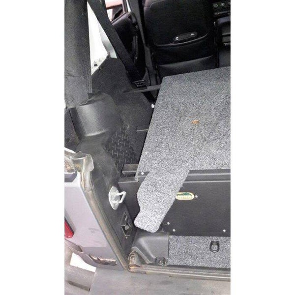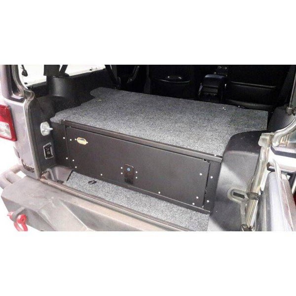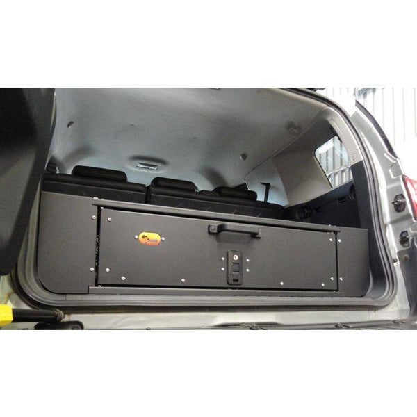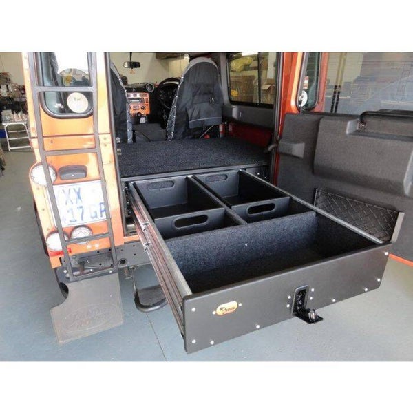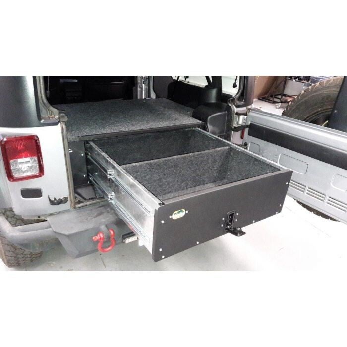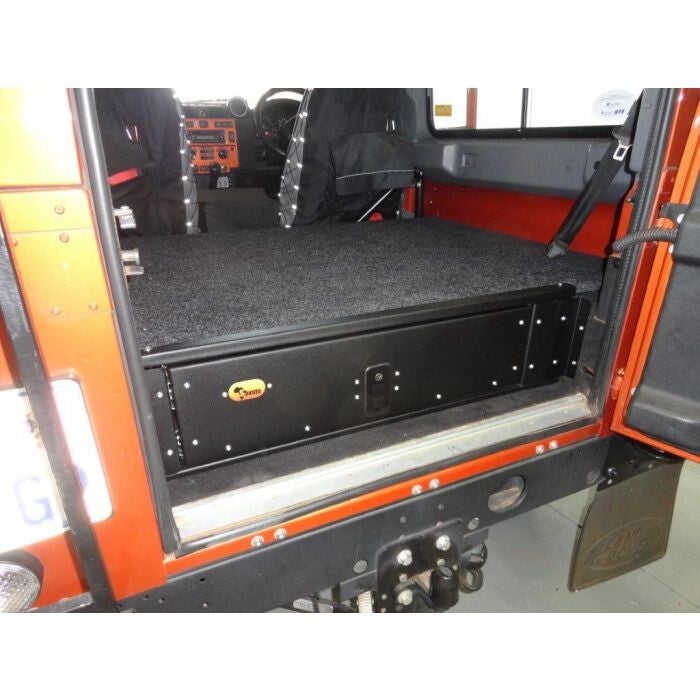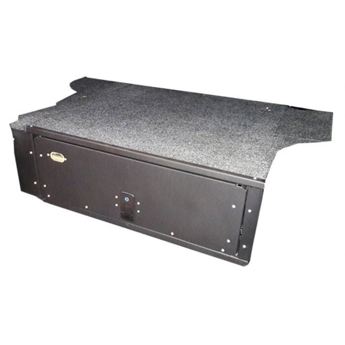 Die Schublade unseres Big Country Schubladensystems läuft auf Schwerlastschienen und kann bis zu 200 kg tragen. Die Schublade ist innen und oben mit Teppich ausgestattet. Es ist auch möglich, die Schublade mit einem Schloss zu verschließen.